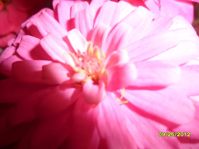 In a little patch under my kitchen window, where a special Azalia bush had gone to compost, Husband planted his Zinnia seeds in nice little rows, somewhat late in the season actually. In July I think. But they stuck their little stems up toward the sun and have given us much pleasure for the end of the season.