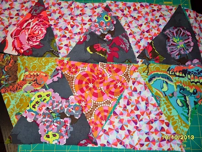 2. I started making the Kaleidoscope blocks, hand stitching, A Kaffe Modern style. This is a long-term project, portable, lots of fussy cutting. A quest of sorts. These are the first, many more to come.
