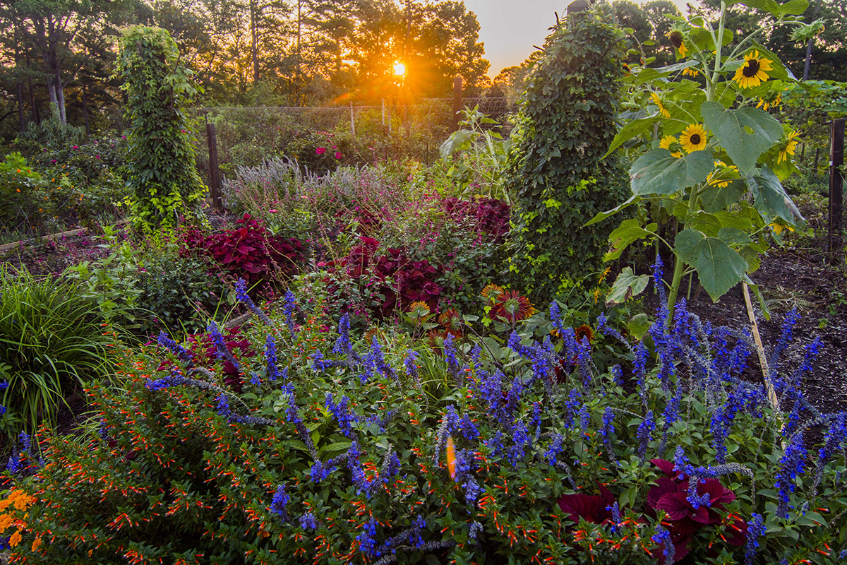 You can easily see the slight withering of leaves right now. We are scheduled for cooler weather and a bit of rain. That always seems to speed thing up. This photo, from the gardens of P. Allen Smith,  caught my eye because of the way the colors blend and how the blues and dark reds pop amidst the green. Beautiful.