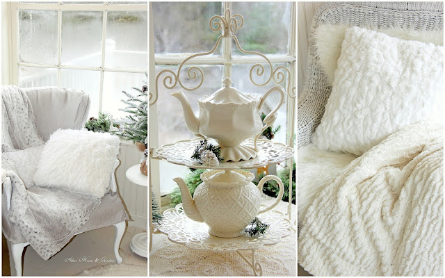 Tea time in these photos is a casual affair in a sun room on a Wintery day. A white them here is a peaceful retreat.
